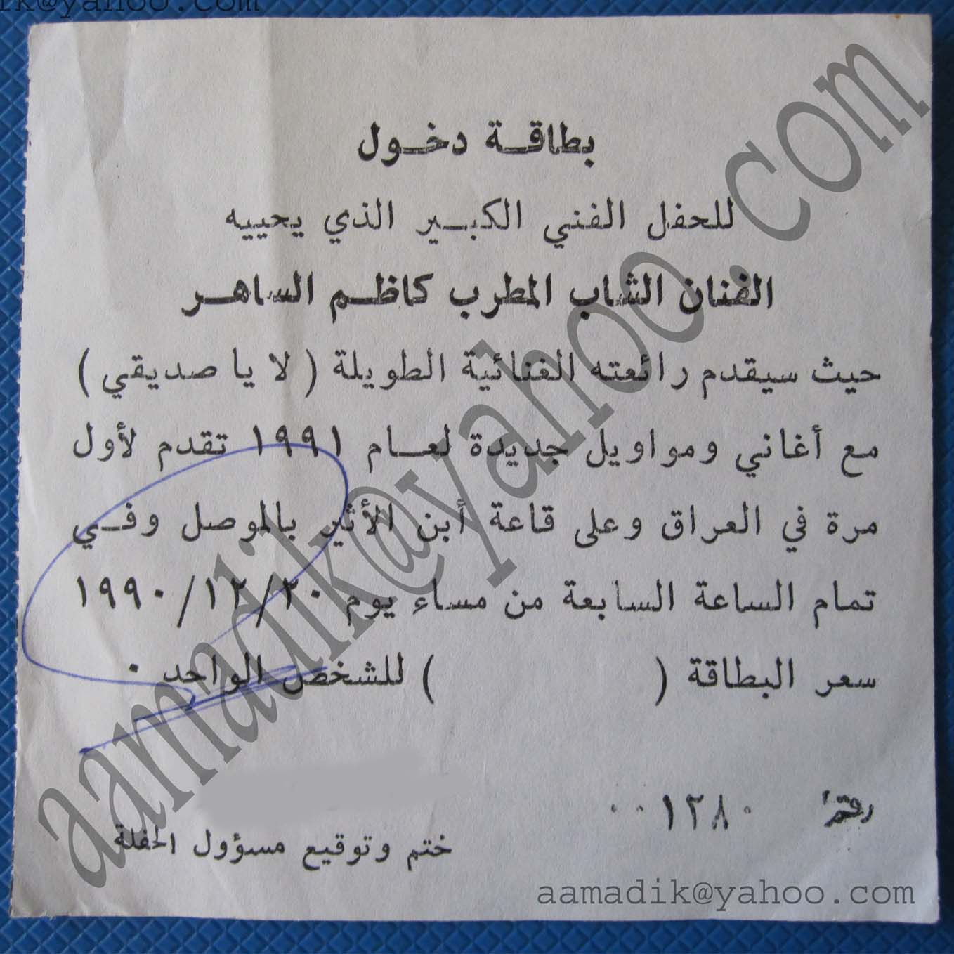 من مقتنياتي اقدم لكم تذكرة دخول نادره لحفلة الفنان الموسيقار العراقي الكبير القيصر كاظم الساهر في بداية مسيرته الفنيه لعام 1990 في مدينة الموصل مسقط راسه وعلى قاعة ابن الاثير حيث قدم ولاول مره على المسرح رائعته الطويله اغنية لاياصديقي وهذه الاغنيه زمنها ساعه كامله وهي من كلمات الشاعر المبدع عزيز الرسام الذي كتب معظم اغاني القيصر في بداياته وكان السبب في شهرته الفنيه حيث انفصل عنه لاسباب مجهوله واتذكر بان الساهر ابدع باداء الاغنيه على المسرح بالرغم من وجود فرقه موسيقيه بسيطه جدا مؤلفه من خمسة عازفين فقط وكورال اثنين وهندسة صوت واناره اعتياديه وحضر الحفله اكثر من 1200 شخص وهذا العدد كبير جدا بالنسبه لمطرب جديد وعندما بدأ كاظم بالغناء سكت الجمهور وكأنه لم يوجد احد في الصاله واخذوا يستمعون للساهر وهو يؤدي هذه الملحمه الجميله وبين فواصل الاغنيه يبدأ الجمهور بالتصفيق ثم السكوت مرة ثانيه للاصغاء للاغنيه وهكذا لحين اكتمال الاغنيه