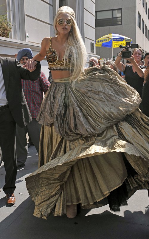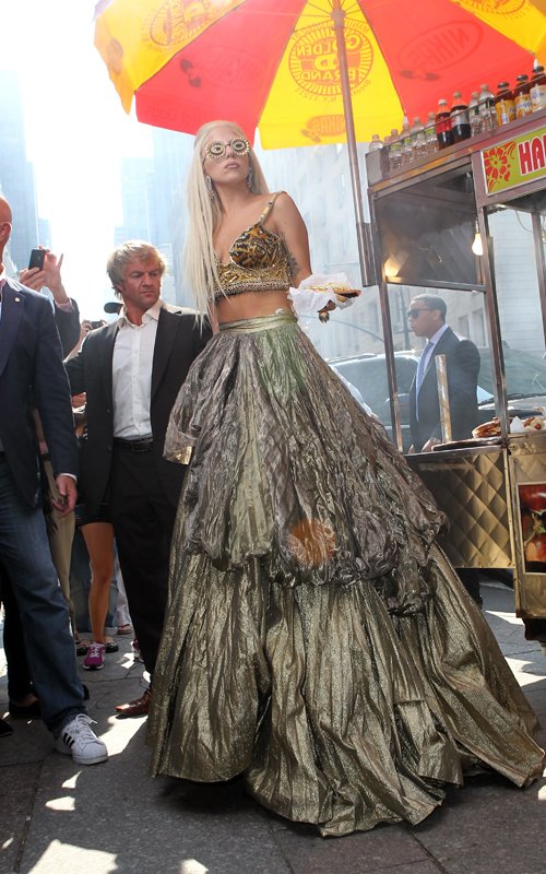 ارتدت الليدى جاجا, خلال جلسة تصوير فى مدينة نيويورك خاصة بـ” Vanity Fair “, كعادتها ملابس ملفته للنظر وكان فستانها “سيئاً” للغاية، إضافة إلى نظارة تخفى عينيها ولا تظهر سوى حدقة عينها؛ ولم تكتف جاجا بذلك، بل وظهرت بقامة طويلة “زيادة عن اللزوم”، حيث فاجأت كل من رآها لأنها عرفت من أول ظهورها بقصر القامة، وقد تبين أن جاجا كانت ترتدى بقدميها “قطع خشبية” طويلة مما جعلها أثناء سيرها لأن تفقد توازنها وتقع على الأرض ولكنها لم تصب بأذى، وبمجرد وقوعها على الأرض أصيب كل الموجودين بحالة من الضحك الهيستيرى.