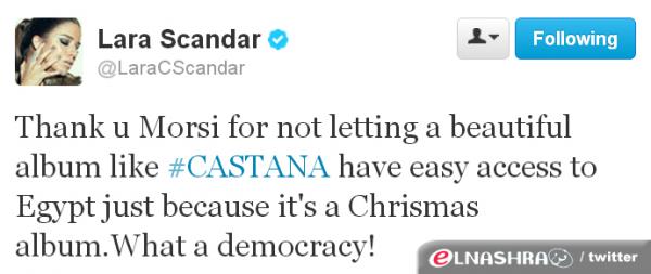 وكتبت لارا من خلال التويت التالي: "شكراً مرسي لأنك لم تجعل البوماً جميلاً كـ"كستنا" يمر بطريقة سهلة إلى مصر لأنه ألبوم عن عيد الميلاد. يا لها من ديمقراطية".