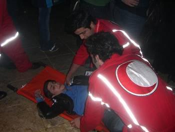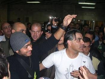 وعلى باب المطار صعد تامر على ظهر سيارته ، وحيا محبيه ، ونثر فوقهم الأزهار ، لتصعد من بينهم فتاة احتضنت تامر طويلاً ، ووقفت إلى جانبه قبل أن ينزلها عناصر الأمن مغماً عليها ، فجلست إلى جانب فتاة أخرى أغمي عليها بعد أن منعها عناصر الأمن من الحصول على ثياب تامر.