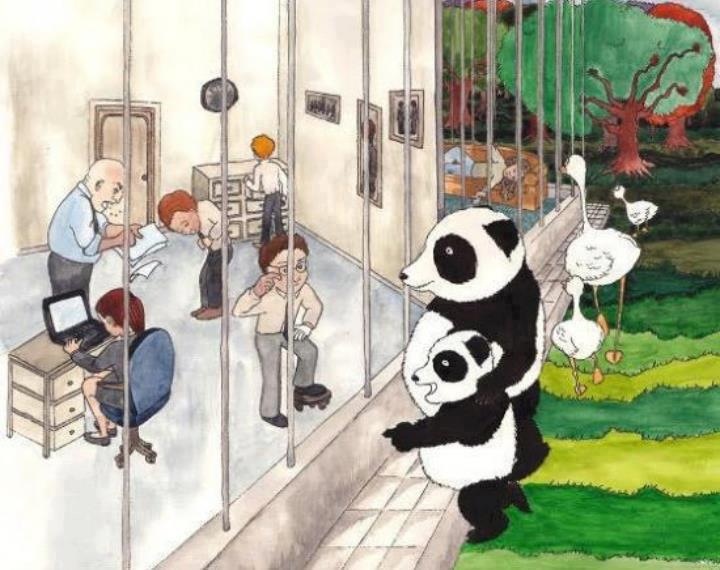 والحيوانات عم تتفرج ع حديقة الإنسان عائلات الآباء وأبناءهم كون الفكرة انعكست وراحت أيام تروح العائلة ع حديقة الحيوانات