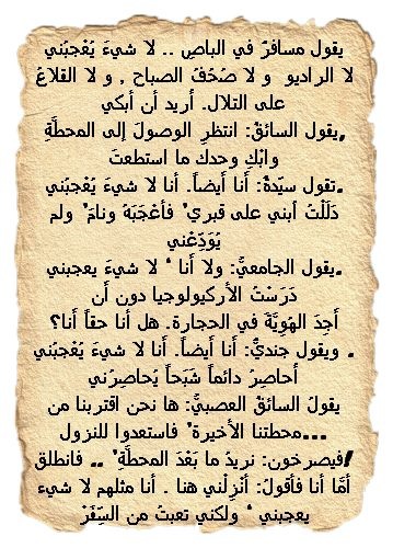 ( أما أنا فأقول أنزلني هنا .أنا مثلهم .. . لا شيء يعجبني ... لكني تعبت من السفر ....