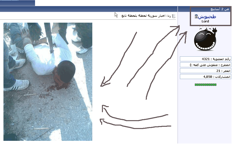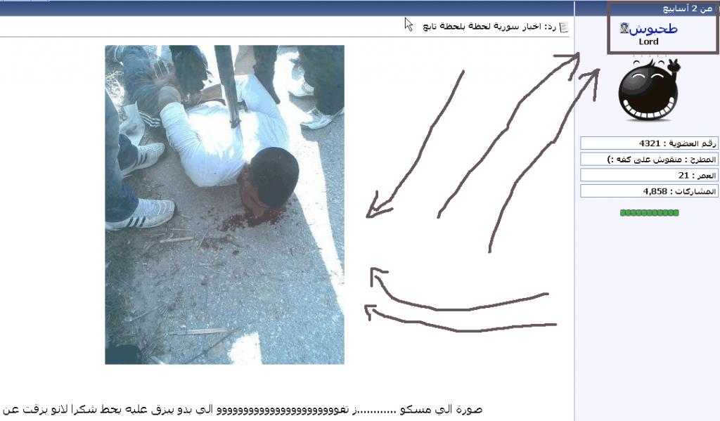 فبتفاجئ اليوم على صفحة الثورة انو كاتبين انو صاحب هالصورة الي بالمقطع هو شب شريف عم يقتلو الشبيحة ؟!!!!!!!!!!!!!!!