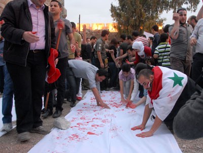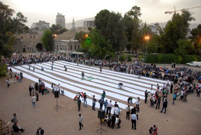 بمشاركة 3000 شخص من مختلف الفئات العمرية بدأت مساء أمس الاربعاء في قلعة دمشق تظاهرة /يدا بيد نلون علمنا..سورية بلدنا/ لتلوين أكبر نسخة من علم سورية تعزيزا للوحدة الوطنية عبر ترك بصمات المشاركين بألوان العلم الأربعة