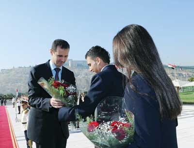 وبعد عزف النشيد الوطني استعرض الرئيس الأسد حرس الشرف بعدها قدمت فتاة وفتى من ابناء الشهداء طاقتين من الزهور إلى سيادته.‏