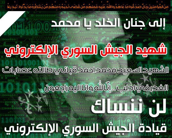 قيادة الجيش السوري الالكتروني تهنئ شعبنا السوري وتزف لكم خبر استشهاد اول شهداء الجيش السوري الالكتروني الشهيد الشاب محمد احمد قباني الذي سقط على يد عصابات الغدر والخيانة في مدينة ادلب العزيزية .