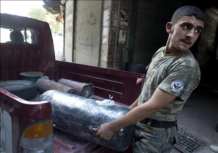 مسلح سوري يفرغ عبوات ناسفة من عربة في المدينة القديمة في حلب أمس (أ ف ب)