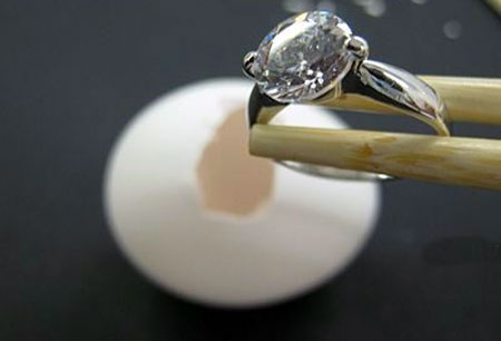 2) تُدخل قطعة المجوهرات داخل البيضة الفارغة من الثقب الصغير