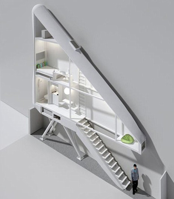 على الرغم من مساحته الضيقة جداً فإنه يحتوي على غرفة نوم ومطبخ ودورة مياه بالإضافة إلى غرفة معيشة ويتكون من طابقين يمكن التنقل بينهما بالسلالم!
