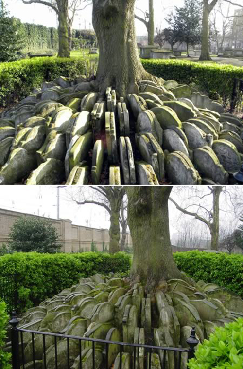 إحدى المقابر العجيبة حيث تظهر شواهد قبور مكدسة حول شجرة حيث كان قد تم نقل رفات الأموات بها في القرن الـ19 أثناء إنشاء خط السكك الحديدية بين "لندن" و"ميدلاند" في بريطانيا، وقد أشرف على صنع تلك المقبرة الغريبة المعماري "توماس هاردي" الذي كان أيضاً مؤلفاً معروفاً.