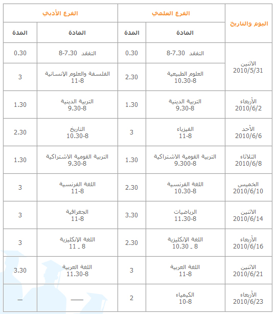 رد: البرنامج الامتحاني للشهادة الثانوية 2010 بفرعيها العلمي والادبي