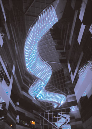 وقد صممت الثريا التي تمتاز بتناغم تفاعلي من المصابيح الضوئية على شكل أفعى تتوسط الجانب العلوي من المبنى المبتكر على كورنيش الدوحة، والذي تم تشييده على شكل جبلين متجاورين، لتبدو كأنها نهر دافق ينساب في سماء البناية .