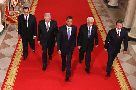 وكانت الصورة الأصلية التي التقطت في البيت الأبيض عندما اعلن عن عودة المفاوضات المباشرة تظهر الرئيس الأميركي باراك اوباما في المقدمة وخلفه كل من رئيس السلطة الفلسطينية محمود عباس ورئيس الوزراء الاسرائيلي بنيامين نتانياهو ثم ملك الأردن عبد الله الثاني والرئيس مبارك.