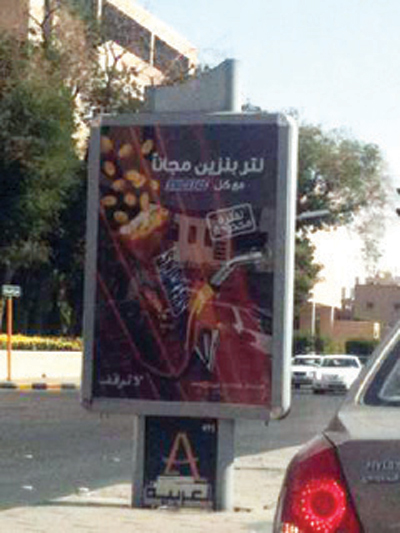 تنتشر في شوارع العاصمة السعودية الرياض لوحات اعلانية تروج لشراء الشوكولاتة عبر اغراء المستهلكين بالحصول على ليتر من البنزين مقابل كل قطعة.