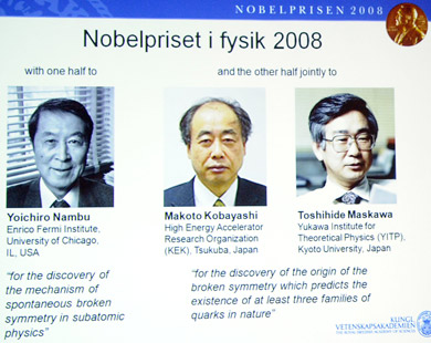 وجاء في بيان للجنة نوبل للفيزياء بالأكاديمية السويدية أن العالمين اليابانيين فازا بالجائزة لاكتشافهما "أصل الكسر التلقائي للتناسق الذي يفترض وجود ثلاث مجموعات على الأقل من جزئيات أساسية مشحونة في الطبيعة".