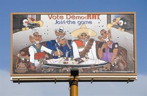 وكتبت في اعلى هذا الملصق الكاريكاتوري الملون عبارة «صوتوا للديمقراطيين» (Vote democrat) وقد تم التلاعب بأحرفها بحيث يصبح معناها «صوتوا للجرذ» (Vote DemocRat).