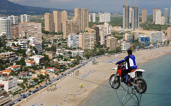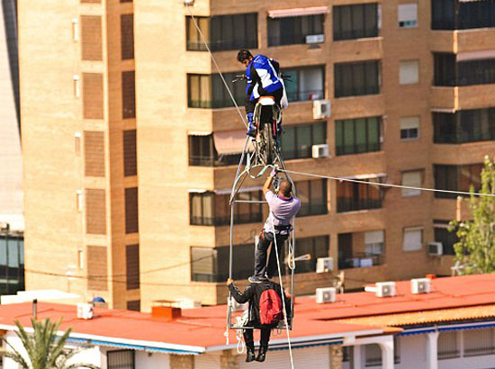 على فكرة إذا انتبهتو عالصور هو مو متعذب بالتوازن عالحبل هو بس شغلتو يدوس بنزين و الشغلة مدروسة و ما فيا خطر على حياتو..
