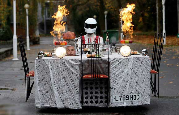 البريطاني بيري واتكنز يقود سيارته التي حولها إلى شكل طاولة طعام خلال عرض سبق معرضاً للسيارات في إيسن ....