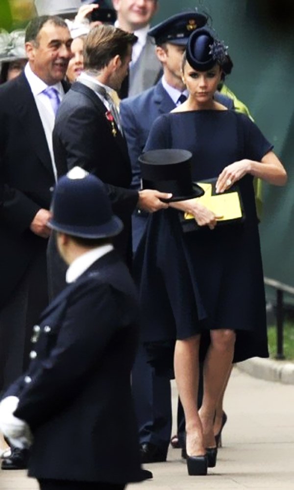 وحضر بيكام وزوجته قبل ساعتين من انطلاق حفل الزفاف؛ حيث حرص على ارتداء بذلة كلاسيكية أنيقة ملائمة للتقاليد والأعراف البريطانية في مناسبات الزفاف الملكية، في حين ارتدت زوجته فيكتوريا قبعة سوداء ورداء أسود غاية في الجمال.