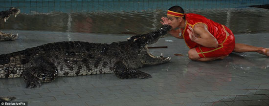 وفى خلال العرض الذى استمر لمدة ساعة يضع الحارس رأسه بين فكى أكبر التماسيح بالحديقة.