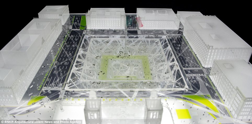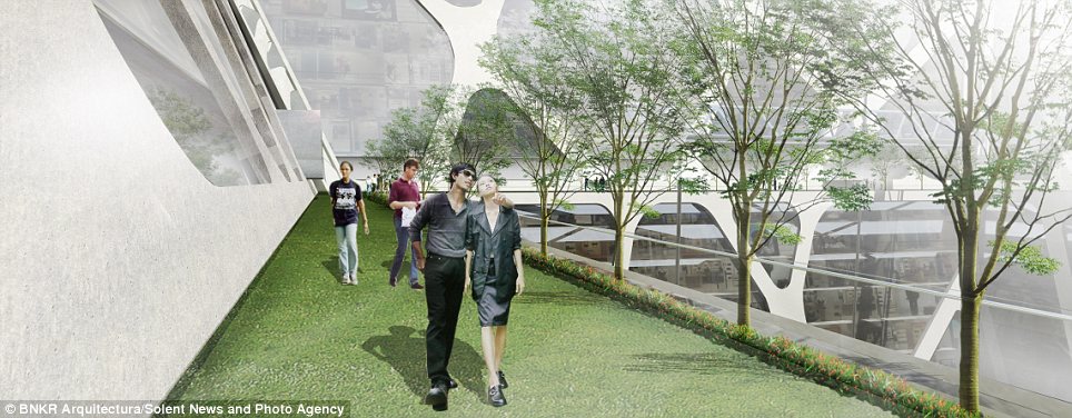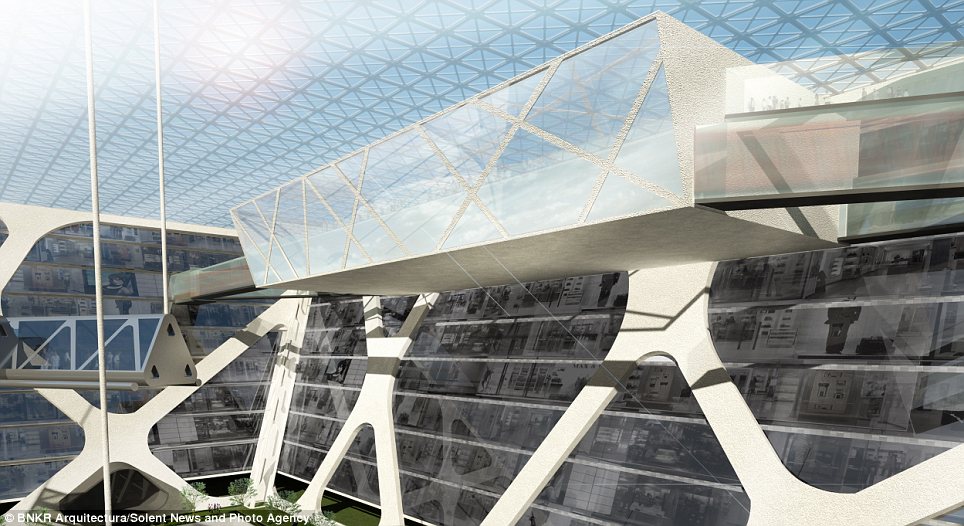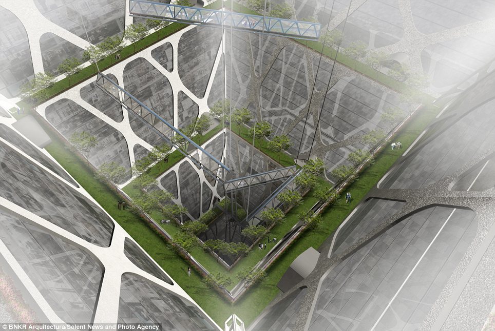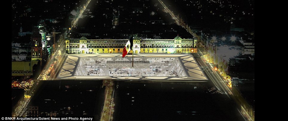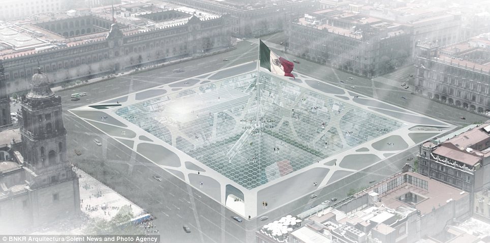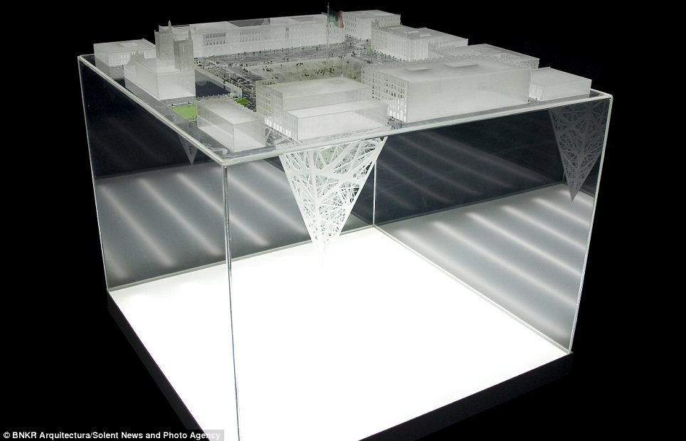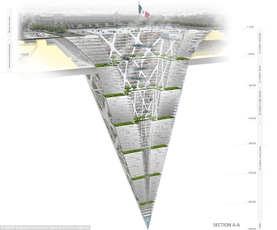 وصممت مجموعة مهندسين أول مبنى يمتد لنحو 300 متر في عمق الأرض، على شكل هرم مقلوب، ليتكون من 10 طوابق سكنية، و35 طابقا للمكاتب والمحلات.ويبدو أن العقل البشري قرر أن يحتل باطن الأرض بالمساحات السكنية، بدلا من الهواء، بعدما منعت السلطات المحلية احتلال الهواء للحفاظ على طابع المدينة التاريخي.وسيتألف الطابق الأرضي للمبنى من مساحة زجاجية ضخمة (240 * 240 مترا)، تظهر جميع الطوابق الموجودة في الأسفل. والهدف من الزجاج إدخال النور الطبيعي للأسفل، بالإضافة إلى تحويله إلى مركز جذب سياحي عالمي، على أن يتوسط هذه المساحة الزجاجية راية العلم المكسيكي، كما هو حاصل في الرقعة الجغرافية نفسها الآن.وقال استيبان سواريز، أحد فريق المهندسين المصممين للمبنى الأول من نوعه: إنه سيحتوي على محلات للبيع، ولمكاتب وشقق سكنية. واستطرد قائلا: إن مدينة نيو مكسيكو كانت بحاجة ماسة إلى تغيير حقيقي، و”بما أن القوانين التنظيمية تسمح فقط ببناء 8 طوابق للأعلى، كان الحل الوحيد هو الذهاب للأسفل” على حد تعبيره.واعتبر سواريز -في تصريحات لصحيفة “ديلي ميل”- أن ناطحة الأرض ستكرس المكانة الحضارية لساحة وسط المدينة وللمباني التاريخية المحيطة به. كما ستشكل المساحة الزجاجية الفارغة مرتعا لعقد المعارض والحفلات وحتى العروض العسكرية.وتشكل الأهرامات جزءًا مهما من إرث المكسيك، حيث تنتشر بأعداد كبيرة. وأوضح المهندس أن تاريخ المكسيك حافل بالحضارات، وبأن كل جيش محتل كان يبني عقاراته على أنقاض الحضارة السابقة، مضيفا “أن الهدف من هذا المبنى هو الذهاب في العمق لتأمل جذورنا التاريخية”.