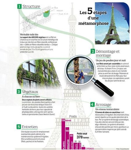 وأصدرت شركة الاستشارات التي تروج للفكرة بيانا يوم الأربعاء للدفاع عن مشروع قالت انه سيرمز إلى التوافق بين الطبيعة والجنس البشري في وقت يقارب فيه عدد سكان العالم تسعة مليارات نسمة بينهم سبعة مليارات يعيشون في المدن، ويجذب البرج الذي شيده جوستاف ايفل في عام 1889 وخضع لتعديل ابسط من هذا قبل عشر سنوات بإضافة 10 آلاف مصباح يضيء ويطفئ بالتبادل نحو سبعة ملايين زائر سنويا.
