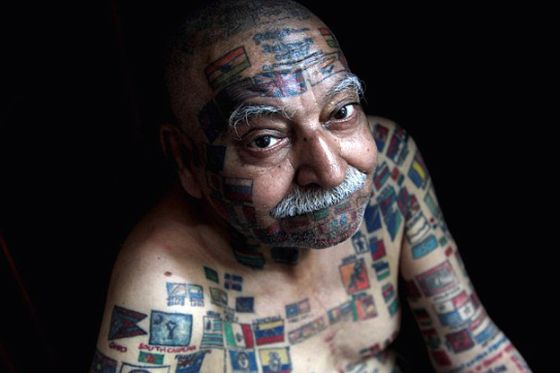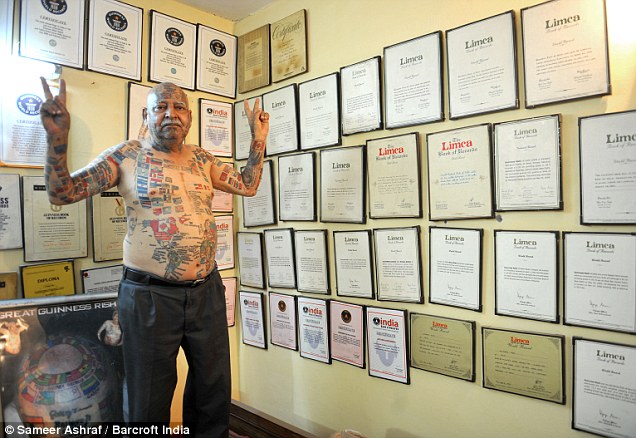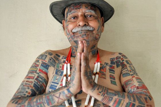 أقدم هندي مهووس بتسجيل الأرقام القياسية على وشم 655 علما وخريطة لمختلف دول العالم بالإضافة إلى آلاف الحروف على جسده.