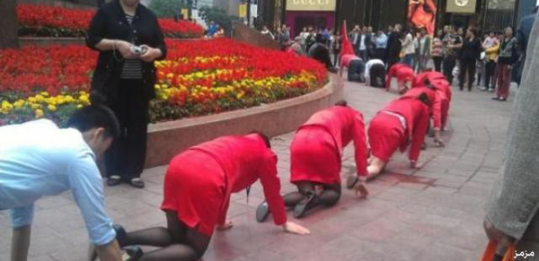 شهد أحد شوارع مدينة “تشونغتشينغ” الصينية حدث غريب من نوعه، حيث فوجئ المارة في أحد الأحياء التجارية الصينية المزدحمة بمدير شركة مستحضرات تجميل يجبر موظفيه على الركوع والزحف على أرجلهم وأيديهم في ميدان عام. وقد تم تصوير المشهد وبثه على حسابات بعض المدونين الصينيين وسط حالة من السخط والغضب بين المارة الذين قام بعضهم بالاتصال بالشرطة التي اكتفت بتفريق الموظفين. وقد تم الكشف بعد ذلك أن المدير كان يرغب في اختبار مدى قدرتهم على الصمود وتقبل الإهانة حتى يتمكن من استغلالهم لأقصى حد ممكن في العمل. وتداولت الصحف الصينية الخبر باستهجان كبير وأعربت عن استيائها من عدم تدخل الشرطة ومعاقبة المدير على مخالفة للقوانين وكل ما اكتفت به هو انتقاده وتوبيخه، مضيفة أن ظروف العمل غير الإنسانية معروفة في الصين لكن هذه الحادثة تخطت كل مستويات العبودية.