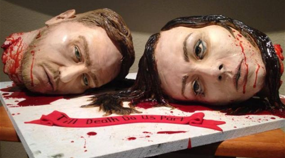أصيب المدعوون إلى حفل زفاف عروسين أمريكيين بالذعر والهلع عندما شاهدوا رأسيهما مفصولين عن جسديهما وتغطيهما الدماء، ليتضح فيما بعد أنها مجرد فكرة طريفة لكعكة الزفاف استخدم فيها نموذجين لرأسي العروسين.