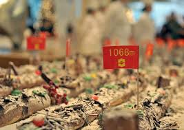 تم الكشف عن اطول كعكة في العالم، احتفالا بعيد الميلاد المجيد "الكريسماس" بالصين يبلغ طولها 1 كيلو متر. الكعكة الأطول قام بتصنيعها 80 طاهيا بفندق بودنج، بشانغهاي في الصين، وتحتوي على 904 بيضات، 1045 كيلوجراما من الطحين، 209 كيلوجرامات من السكر، 401 كيلو جرام من الشيكولاتة، و 34 كيلو جراما من الفانيليا، وبلغ قياسها 1068 متر.