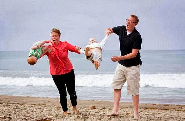 حيث يظهر فيها أبٌ وأمٌ يقذفان طفليهما في الهواء على شاطىء البحر.