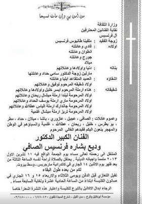 وسيشيع جثمان الفنان الصافي بعد ظهر الاثنين القادم في كاتدرائية مار جرجس وسط العاصمة بيروت.