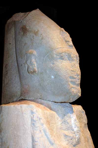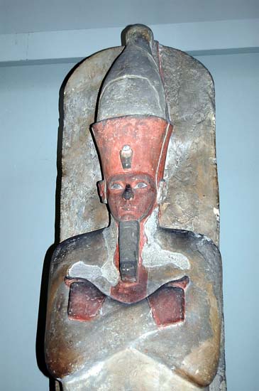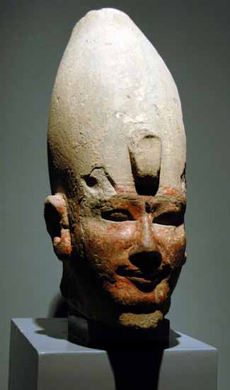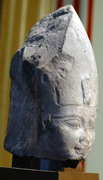 عثر على هذا الرأس الجيد النحت فى الكرنك. و كان فى الأصل جزءاً من تمثال فى شكل مومياء ليشبه أوزوريس. وكان يتألق بألوان؛ الأبيض للتاج والذقن، والأصفر للصل المقدس أو الكوبرا الملكية، والأحمر الزاهى للوجه. ويدل لمعان الألوان على أن هذا الرأس يؤرخ إلى حقبة جديدة ولا ترتبط بالتقاليد. غير أن العينين بالمقلتين المستديرتين ممثلتين بطبيعية، كما أن الحواجب مزينة بخطوط من النحت الغائر جداً، وكل هذه الخصائص سبقت طراز فن التحامسة.