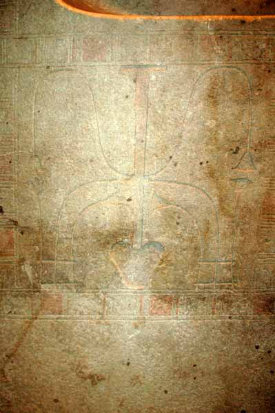 وتبدو يده اليسرى خلف الرب آمون رع الذي يحمل علامة الحياة (عنخ)، وتبدو اليد اليسرى للرب آمون رع خلف الملك أحمس الذي تبدو يده اليمنى خلف آمون رع.