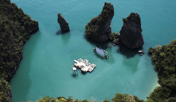 استغل إشرين الطبيعة الساحرة لتايلاند فقام ببناء السينما وسط الماء بين صخور تايلاند الخلابة، واستوحى الفكرة من جزر تايلاند المتناثرة فقام بتصميم المسرح من مجموعة أخشاب طافية، وزاد عليها جمالاً بأن تم بناء المسرح من مواد معاد تصنيعها.