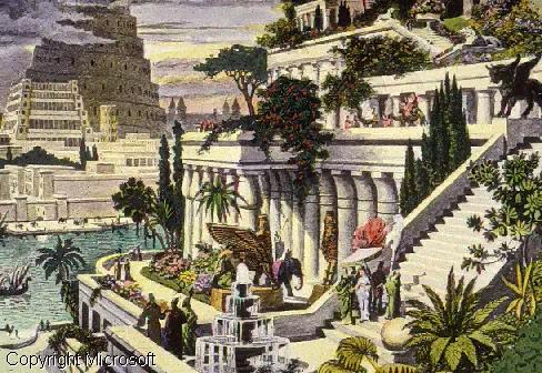 حدائق بابل المعلقة وهي عبارة عن أربعة أفدنه علي شكل شرفات معلقة علي أعمدة ارتفاعها 75 قدما