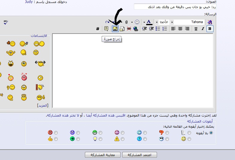 •عند رغبتك بإضافة صور لموضوعك في المنتدى ، احرص على ألا يكون حجمها كبير حتى لا تستغرق وقتاً طويلاً لتحميلها وأن تكون في سياق الموضوع لا خارجه عنه.