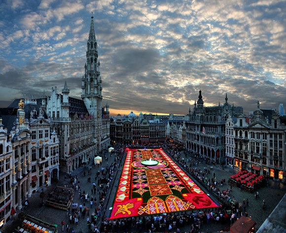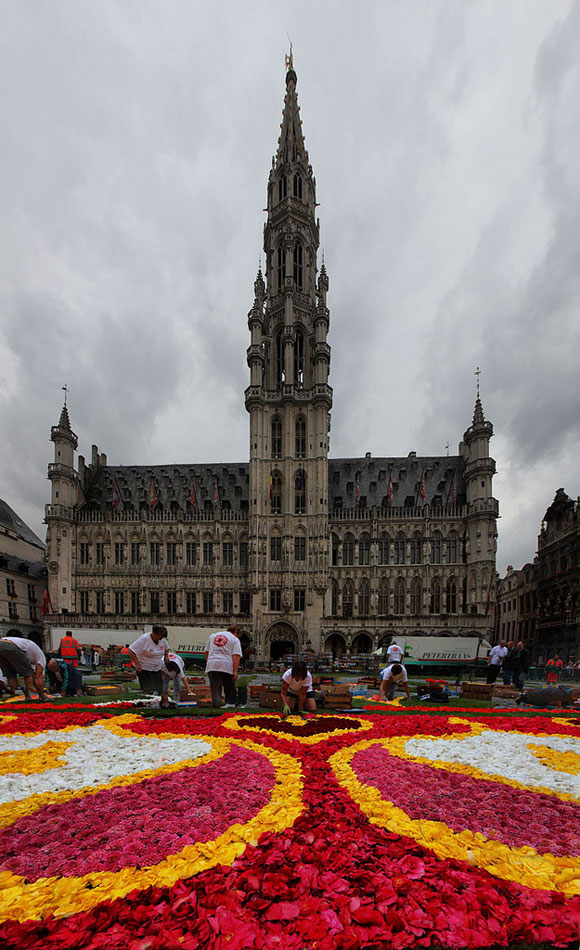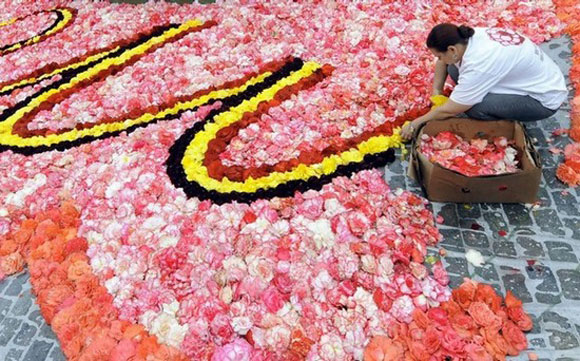 تم تصميم وتنفيذ هذه السجادة الرائعة في العاصمة البلجيكية بروكسل خلال الشهور الثلاثة الماضية، حيث اجتمع المئات من مختصي الزهور لاستخدام زهرة البيجونيا في صناعة هذه السجادة المدهشة.