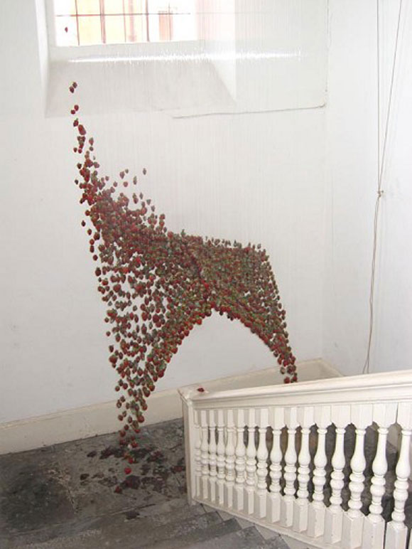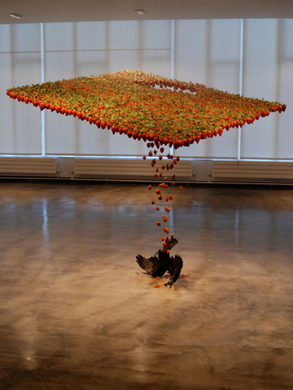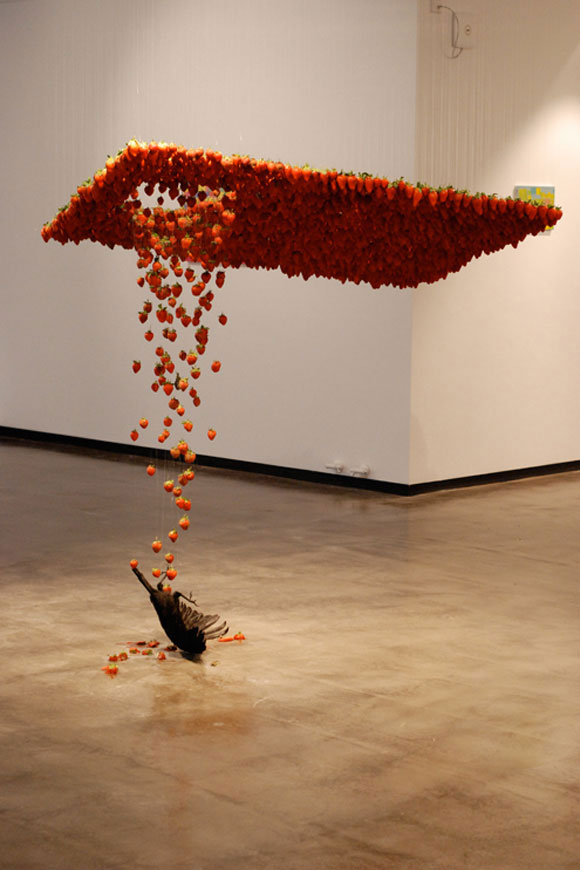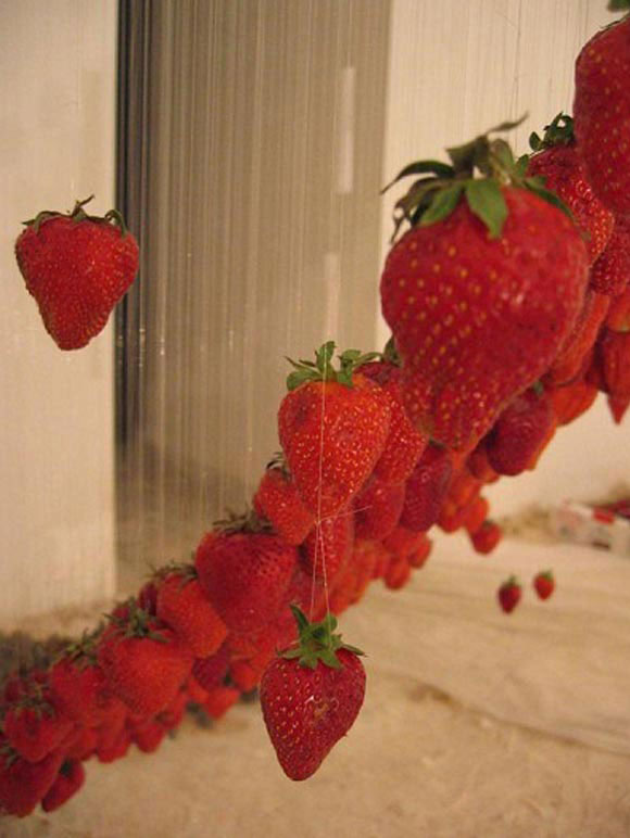فهذه الصورة التي تبدو كما لو كانت لقطة من فيلم متحرك لطائر يخترق صفاً من قطع الفراولة، هي في الحقيقة عمل فني ستراه هكذا كيفما ووقتما نظرت إليه!