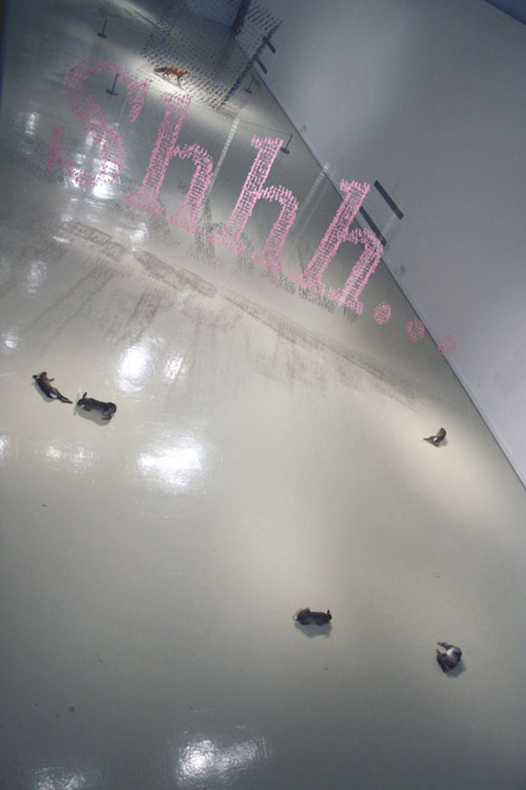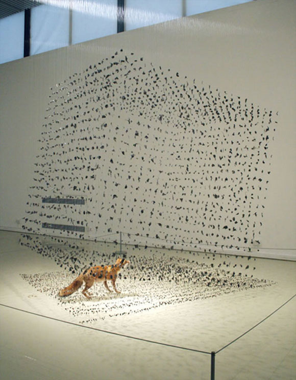 والفكرة ببساطة هي وجود خيوط رفيعة جداً من النايلون مثبتة في سقف المعرض ومربوطة بكافة عناصر العمل الفني لتشعرك وكأن العمل بأكمله عائم في الهواء!!