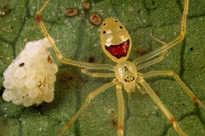 العنكبوت الذي يعيش في جزيرة هاواي و هو المعروف باسم “العنكبوت سعيد الوجه “. وموطنه في غابات الأمطار الإستوائية المحلية لهاواي و النقوش التي رسمت على بطنه تشير بالفعل الى انه مبتسم او يبدو مبتسما.. لكن للأسف هذ النوع من العناكب أصبح مهددا بالإنقراض , وتقريباً له 10أنماط من الأوجه.