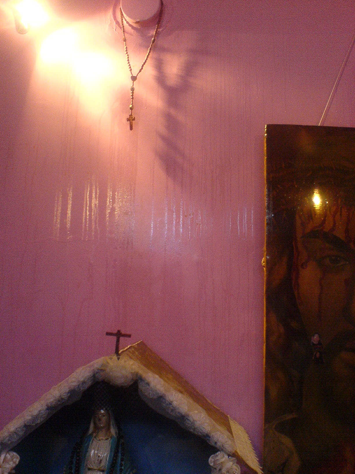 وما مضت أيام قليلة حتى ظهر على الجدار قرب الصور صليب كبير بحجم الصور وكأنه مثبَّتٌ على صخرة، وأصبحت قاعدته تنضح زيتاً كما هو ظاهر في الصورة أسفل المقال كي يتحقق الجميع من صحة حقيقة الظاهرة، وكأن الرب أرسل برسالة للمشكِكين لألا يذهبوا بأذهانهم إلى الشكوك وعدم الإيمان.