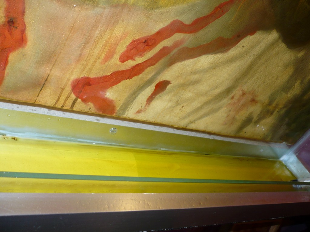 ومن المعروف أن الألوان المائية المرسومة بها هذه الصورة، تتداخل فيما بينها وتتشوه، إذا ما سكبتَ عليها أي سائل كان ماءً أو زيتاً، إلا أن ألوان الصورة هذه لم تتغير أبداً ولم تتداخل فيما بينها أو تتشوه بل بقيت على حالها تماماً، رغم كثرة الزيت الناضح منها يومياً، وهنا يكمن العجب وتتحقق صحة الظاهرة.