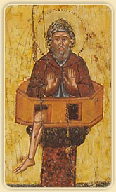 وُلِدَ سمعان حوالي عام 389 م(1) في بلدة سيس ( سيسان ) القريبة من نيقوبوليس ( قرب أضنة بتركيا) وقد أخذ عن والديه ( الأب يوحنا والأم مرتا ) الميسورين مهنة رعي المواشي وهو فتى صغير . وفي يوم مُثلِج وشديد البرودة لم يستطع إخراج قطيعه من الحظيرة فذهب مع والديه إلى الكنيسة حيث استمع إلى الكاهن يردّد الطوباويات التي قالها السيد المسيح في عِظة الجبل : ( طوبى للودعاء . لأنهم يرثون الأرض .......... ) . ( متّى 5 : 3 ـ 11 ) تأثر الفتى سمعان ـ الذي لم يكن قد بلغ من العمر سن الخامسة عشرة ـ بكلمات السيد المسيح . ( وقد ذُكِر َأنه أسرع إلى الكنيسة وتوسّل بحرارة إلى الرب أن يُرشده إلى طريق التقوى وبقي في هذه الحالة وقتاً طويلاً فأخذه النعاس إلى أن غفا . وفي غفوته عاين الرؤية التالية : بدا له كأنه يحفر أساسات لبناء وإذا بصوت يقول : " هذا ليس كافياً عمّق الحفرة أكثر .... " فاستمرّ وعاد إليه الصوت أربع مرّات بنفس الكلمات إلى أن قال له أخيراً : كفاك الآن هيّا باشر بالبناء وسيكون الأمر سهلاً . ) وأدرك سمعان أنها دعوة له من عند الرب ليجاهد في حياة القداسة ، فتألقت نفْسه إلى الصفاء الروحي والميل إلى الحياة النسكية فانضمّ إلى جماعة من النُسَّاك ، قرب سيس فبقي معهم مدة سنتين . ثم انتقل إلى منطقة : تل عادة حيث استقرّ في دير برج السبع الذي يقع غرب تل عادة وغرب مدينة حلب بحوالي 60 كم . حيث كان يٌقيم في الدير حوالي ثمانين راهباً الذي كان يرأسه إيليذوروس الذي تتلمذ على يده في أصول الحياة النسكية . كان يقضي وقته في الصلاة والتقشّف ، ويتناول الطعام مرة واحدة في الأسبوع ، وشدَّ مَرّة حبلاً خشناً على جسده للإمعان في التقشّف ، فأدّى هذا إلى نزف دمه ولم يقبل بمعالجة الجرح فطُلب منه مغادرة الدير كي لا يجاريه بهذا العمل من الرهبان ضعاف البنية . فغادر الدير بعد أن أمضى فيه عشر سنوات . في عام 412 م لجأ سمعان إلى دير تلانيسوس ( ( قرية دير سمعان حالياً ) فعاش في هذه البلدة مدة ثلاث سنوات حيث واصل سمعان جهاده فكان يصوم أيام عدّة يبقى فيها واقفاً مسبّحاً الله ، وأقام في صومعة وصام الصوم الأربعيني منتصباً على قمة العمود ليلاً ونهاراً دون طعام أو شراب رغم وجود عشرة أرغفة من الخبز وجرّة ماء قربه . وأصبح صوم الأربعين عادة لديه رافقته حتى آخر حياته على العمود . غادر سمعان الدير وارتقى قمة الجبل المعروف اليوم باسمه (جبل سمعان الذي يرتفع 886 م عن سطح البحر ويقع شمال غرب حلب بحدود 60 كم ) . ذاعت طريقة حياته والعجائب التي كان يصنعها الله على يديه ، فأقبل الناس عليه بكثرة ، منهم المرضى لينعموا بالشفاء ، ومنهم العواقر لرزقهن الله أولاداً وغيرهم ليمدّهم بالنصح والإرشاد لحل مشاكلهم المستعصية . وكان الزوار يقصدونه من كل حدب وصوب على مختلف جنسياتهم من الفرس والأرمن والعرب ومن الدول الأوروبية مثل اسبانيا وبريطانيا وفرنسا وإيطاليا....كما ساهمت العلاقات التجارية بين أنطاكية والعالم الروماني في ازدياد شهرته حيث توجد له لوحه على صفيحة من الفضة في متحف اللوفر بباريس كما يُذكَر أنه كان يُرسِل تحياته إلى القديسة جنفياف شفيعة باريس مع التجار الذين كانوا يزورونه . كما كانت صورته معروضة في إحدى قاعات الفنانين في روما . وبغية تجنّب مضايقة الزوار العديدين انتصب سمعان على عمود حجري أقيم له بارتفاع ذراعين حسب النص السرياني وبارتفاع ستة أذرع حسب رأي أسقف قورش(3) تيودوريتس ( وُلِدَ عام393م وتوفي بين 458 ـ 466م) . وأخذ العمود يزداد ارتفاعاً ، بازدياد أعداد الجموع التي كانت تقصده حتى وصل إلى ارتفاع 36 ذراعاً حسب قول أسقف قورش .و40 ذراعاً حسب النص السرياني . امضى القديس سمعان على هذا العمود 36 عاماً حسب رأي الأسقف و42 عاماً حسب النص السرياني لم تطأ قدماه الأرض معتزلاً في عُلِّيته المثبّتة في رأس العمود متعرّضاً لعوامل الطبيعة من حرّ وقَرّ ورياح وأمطار وزوابع . ونظراً لأهمية العمود في حياة القديس سمعان ، فلا بد من وصفه بالتفصيل : كان قطر العمود 110 سم وذكرنا ارتفاعه في الفقرة السابقة وكان في أعلى ال