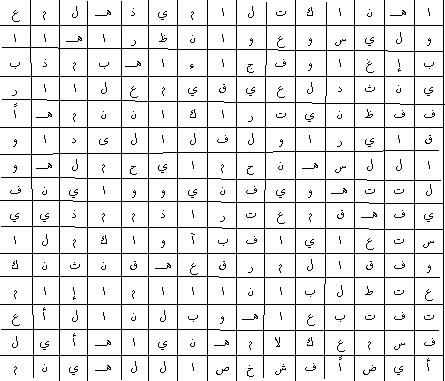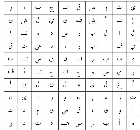 في هذا الجدول تجدُ كلمات نص دعوة التلاميذ الأولين (يوحنّا 1|35_39) ويبقى لكَ ستَّة أحرف لكلمة قالها الربّ يسوع . ما هي هذه الكلمة ؟ ابحث عنها في الإنجيل . واقرأ النص جيدًا ، ثمّ استخرج منه معناها بالنسبة إليكَ ، و ماذا يكلّفك تنفيذها ؟