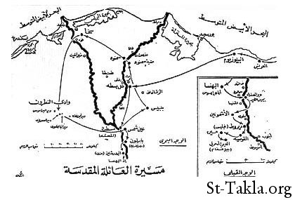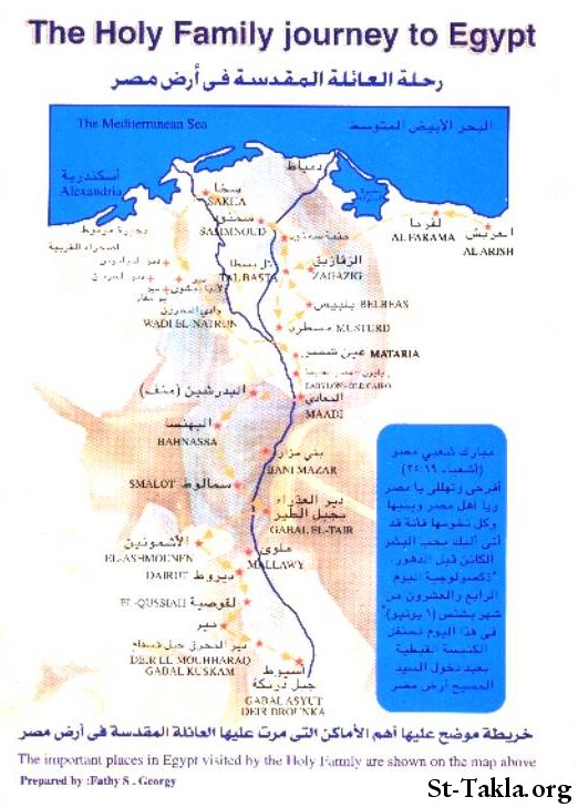 اتجهت العائلة المقدسة بعد ذلك الى بابليون ( مصر القديمه حاليا" ) وسكنت فى المغارة الكائنة بكنيسة القديس سرجيوس ( ابو سرجة ) بمصر القديمة ثم اتجهوا جنوبا" الى المعادى وقد سميت معادى لانهم كانوا يعدون النيل منها وركبوا الى البهنسا ( قرب بنى مزار ) محافظة المنيا الان ثم الى جبل الطير ( شرق مدينة سمالوط حيث يوجد دير للعذراء فوق الجبل )ثم واصلوا مسيرتهم الى الاشمونيين ( قرب ملوى ) تتبع محافظة المنيا الان ) ومنها الى القوصية ( تتبع محافظة اسيوط الان ) فطردهم اهلها فمضوا الى قرية ميرا ( الان مير ) ومنها الى جبل قسقام الذى يوجد به الان دير المحرق وفى جبل قسقام " اذ ملاك الرب قد ظهر فى حلم ليوسف فى مصر قائلا" قم وخذ الصبى وامه وعاد بهم فى طريق العودة الى فلسطين
