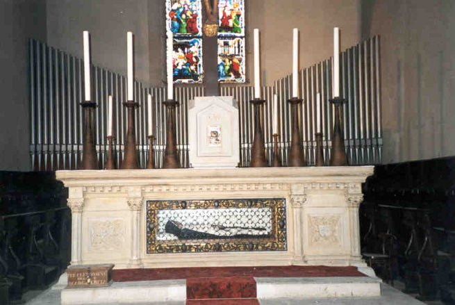 و كان جسها موضوعا في تابوت حجري من أصل روماني وجد في غرانتشيستير و أعيد دفنه.