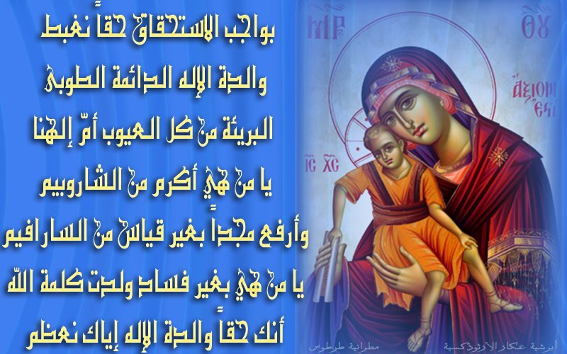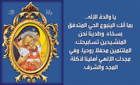 أنتِ فخر المؤمنين، أيتها النقيّة البريئة من كلّ عيب، التي لا عروس لها، أنت حماية المسيحيّين وملجأهم وسورهم وميناؤهم، فإنّك تحملين الابتهالات إلى ابنك، فتخلّصين من الخطوب، الذين بإيمانٍ ولهفةٍ يعرفونك أنّك والدة الإله.