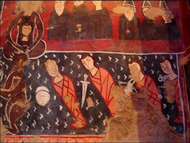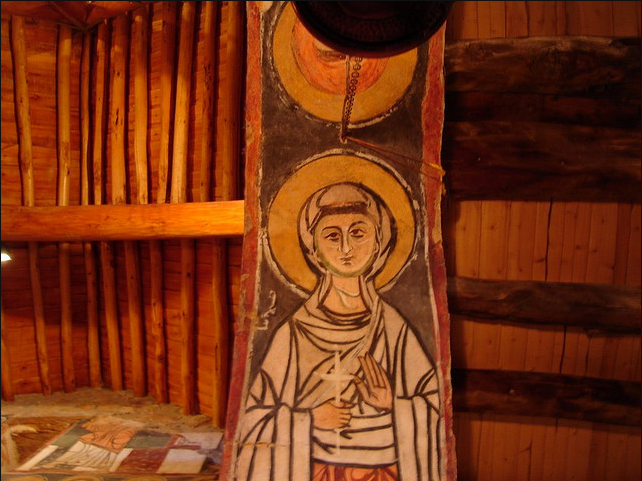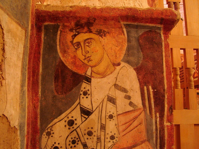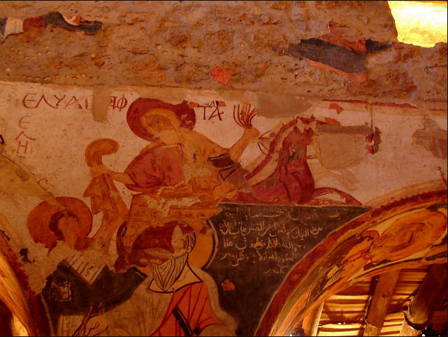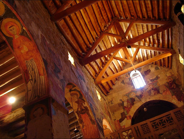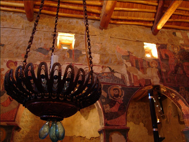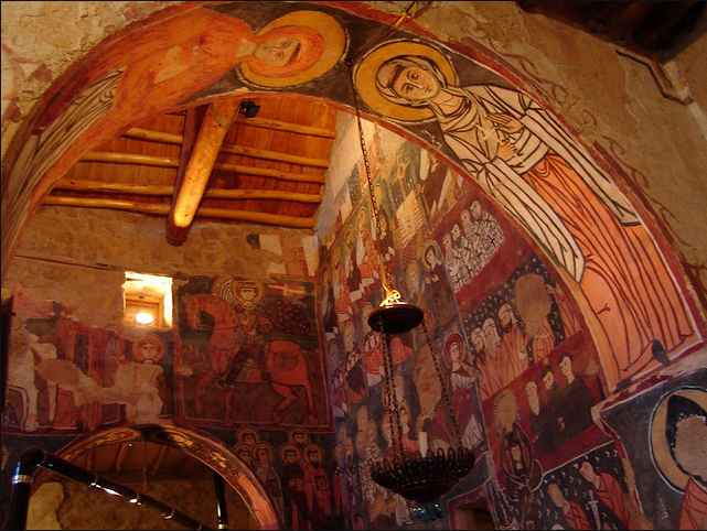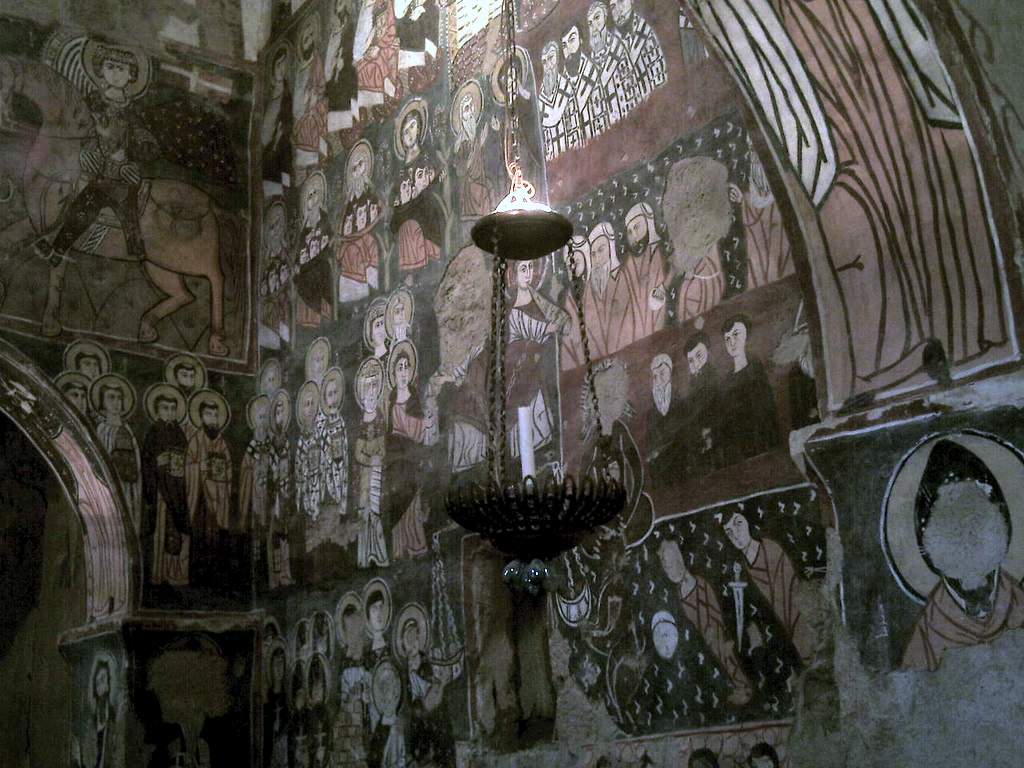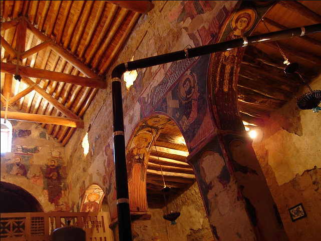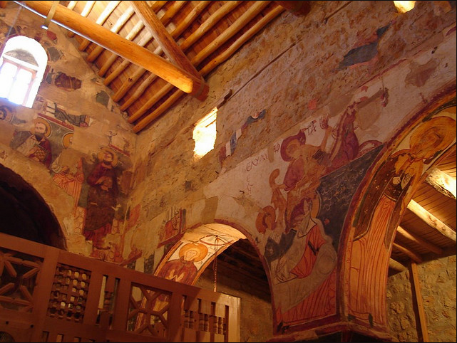 جدران الكنيسة مزينة بسور من نمط الفريسكو تم رسمها فوق بعضها البعض بتلات طبقات و في كتابة بتبينلنا انو هالرسوم تعود لسنة 1058-1096 م و تقول الكتابة " خلص المصور يوم الاحد في رأس تموز سنة 488م الرسومات الجدارية مدهشة ورائعة بس للاسف تم الرسم فوقها مما ادى لتخريبها لحد ما يعني صار بعضون مشوه والبعض الاخر صار واضح جدا متل صورة نجد منشوف فيها شخصٍ شعره طويل يصارع اسداً وعلى أغلب الظن هو شمشمون الجبار ومنشوف على جدار الشمال حاجز الهيكل من خارج جهة صحن الكنيسة اشكال هندسية مع مربعات بيضوممكن تكون هالصورة بتمقل خيمة العهد وحجاب قدس الاقداس و في صورة تانية تمثل النبي ايليا النبي صاعد الى السماء بمركبة نارية وبيمينه يعطي ردائة الى تلميذه اليشاع نبي بالنسةب للطبقة التانية يعود تاريخها الى القرن الحادي عشر و ابرز ما عليها هو مشهد معمودية يسوع على يد يوحنا المعمدان ومنشوف جنبه صور سمعان العامودي بتتميز رسومات الطبقة التانية برهافة الحس الفني الروحاني وبالاسلوب المتبع يلي بيعكس تأثير تطور الفن البيزنطي في المنطقة
