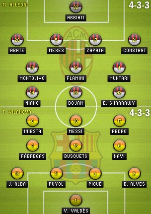 وفي المقابل يدخل البلوغرانا اللقاء وهو متصدر ترتيب الدوري الاسباني بعد ان وسّع الفارق مع مطارده نادي اتلتيكو مدريد ويأتي من فوز صعب خارج الديار امام مستضيفه نادي غرناطة بهدفين مقابل هدف بفضل الهداف الارجنتيني ليونيل ميسي الذي سجل هدفي الانتصار . ووصل النادي الكتالوني الى هذا الدور بعد تصدره للمجموعة السابعة برصيد 13 نقطة بهزيمة وحيدة كانت امام سيلتيك بهدفين مقابل هدف في غلاسكو . وسيدخل برشلونة اللقاء بعد رجوع لاعب خط الوسط تشافي هيرنانديز من الاصابة . ويأمل النادي الكتالوني في اعادة سنياريو الموسم الماضي . يذكر ان الميلان يستحوز على سبع القاب في دوري ابطال اوروبا واخرها كانت عام 2007 بفوزه على ليفربول بهدفين مقابل هدف يتيم ، فيما يملك برشلونة اربعة القاب اخرها عام 2011 بفوزه على مان يونايتد بثلاثة اهداف مقابل هدف وحيد .